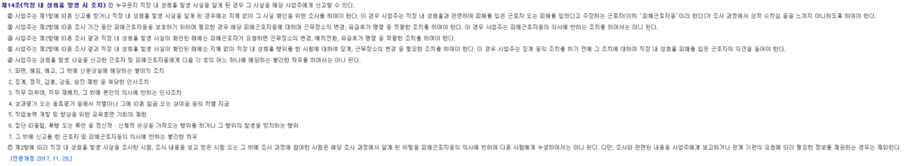 ⑥ ‘(전단 생략) 사업주는 성희롱 발생 사실을 신고한 근로자 및 피해근로자등에게 다음 각 호의 어느 하나에 해당하는 불리한 처우를 하여서는 아니 된다.